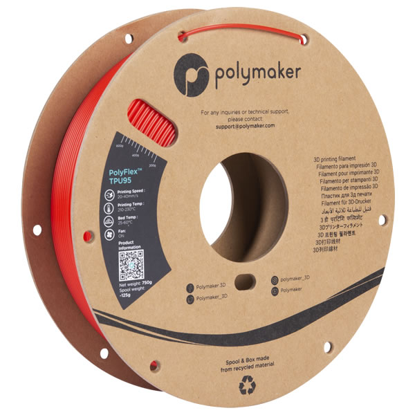 - PolyFlex TPU95は水溶性ではありませんが、大気中の湿気を少量、徐々に吸収しますので、全てのPolyFlex TPU95フィラメントは梱包・発送前に十分に乾燥されています。フィラメントを使用しない時は、フィラメントを湿気に晒すのを避けて最高のプリント性能を確保するため、お届け時にフィラメントが入っていた乾燥剤入りバッグの中で密閉して保管することを強く推奨します。
