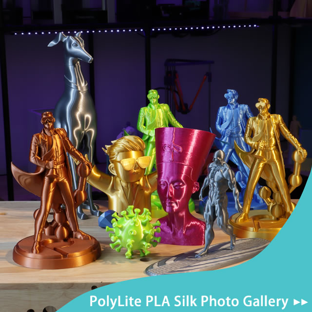 PolyLite™ PLA Silkは、シルク質感のあるPLA素材です。表面が滑らかで光沢のある美しい造形物をプリントできます。