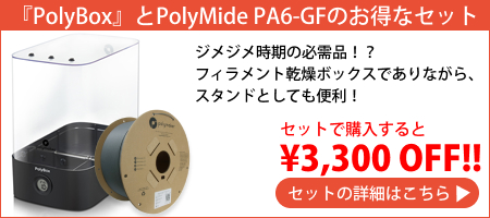- 印刷する時、PolyBoxと一緒のご利用をお勧めします。また最良の印刷結果を得るためには、材料を常に乾燥状態に保つためにPolyBoxやビニール袋の中に保管することをお勧めします。